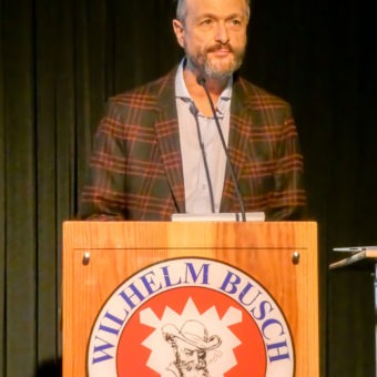 Ob er da seine Hände wohl mit im Spiel hatte, der gute Wilhelm Busch? Man hatte fast den Eindruck, als der bekannte Autor Frank Suchland eine Laudatio hielt mit humorvollem Blick auf das eingeschickte Gedicht. Als er dann den Hans Huckebein Preisträger auf die Bühne holte, sagte dieser zur Verwunderung aller: „Ich bin es gar nicht. Mein Kollege sitzt dahinten und er hat das geschrieben. Ein bisschen erinnerte es an ein Theaterstück und wer weiß, vielleicht hat Wilhelm Buch selbst den Regisseur gespielt. Er hätte bestimmt seine Freude daran gehabt. Der Hans-Huckebein-Preis ist in diesem Jahr an Dieter Brandl (Mäusehochzeit) und Volker Henning (Das Match) verliehen worden. Für Henning ist es das erste Mal, diesen Preis verliehen zu bekommen, für Dieter Brandl nicht. Er ist ein Wiederholungstäter, denn er bekam den Preis schon 2013 und 2015. Obwohl alle Texte anonym eingereicht werden und eine fünfköpfige Jury die Gewinner anonym entscheidet, ist Suchland dieser Fauxpas passiert.