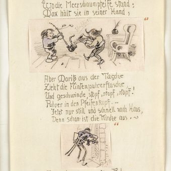 Und mit Buch und Notenheften, Nach besorgten Amtsgeschäften, Lenkt er freudig seine Schritte Zu der heimatlichen Hütte, Und voll Dankbarkeit sodann Zündet er sein Pfeifchen an.