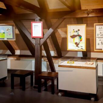 Daneben hatten der Kater Franz mit seinen humorvollen Turnübungen und der „vorletzte Panda“ ihre Solo-Auftritte als Bilderbuchhelden. Beide Figuren sind, ebenso wie Helmut das Erdferkel, mit großen, farbigen Porträts in der Ausstellung vertreten. Diese Porträts zeigen die charakteristische Zeichentechnik von Raddatz und bieten einen intensiven Blick auf die von ihr geschaffenen Figuren. Sie spiegeln die Fähigkeit der Künstlerin wider, Emotionen und Persönlichkeit mit wenigen Strichen zum Ausdruck zu bringen.